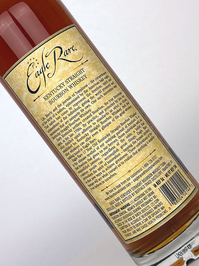 This edition of Eagle Rare 17 Year Old was distilled in the Spring of 2007 at the Buffalo Trace Distillery and bottled in the Fall of 2024 after an 86% loss due to evaporation.